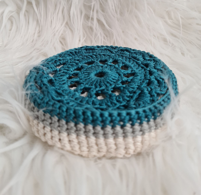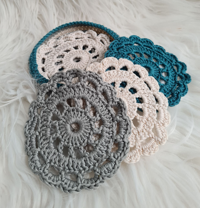 Set of six crochet coasters in a flower style design which will bring a cosy feel to your home, or a perfect housewarming gift for others. There are two coasters of each colour (off white, grey & turquoise) in a handy holder.