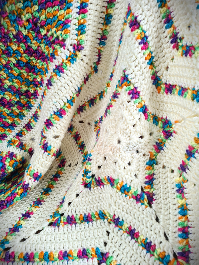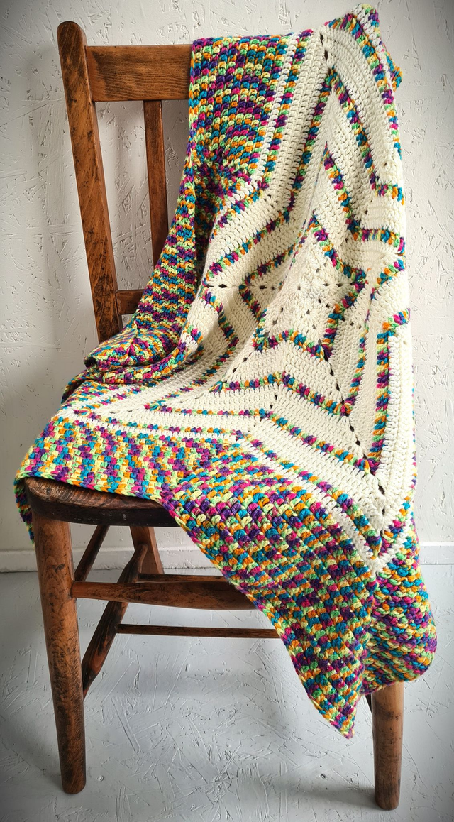 A beautiful snuggly five-point star blanket, perfect for a baby, child or as a lap blanket. With vibrant rainbow colours and contrasting cream it's suitable for anyone.