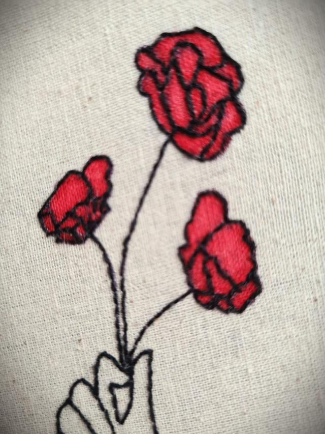 Hand stitched design featuring red flowers hand-painted using watercolour pencils and aloe vera gel. The red hoop is hand painted using acrylic paint. Looks lovely either hung on a wall or propped up on a shelf.