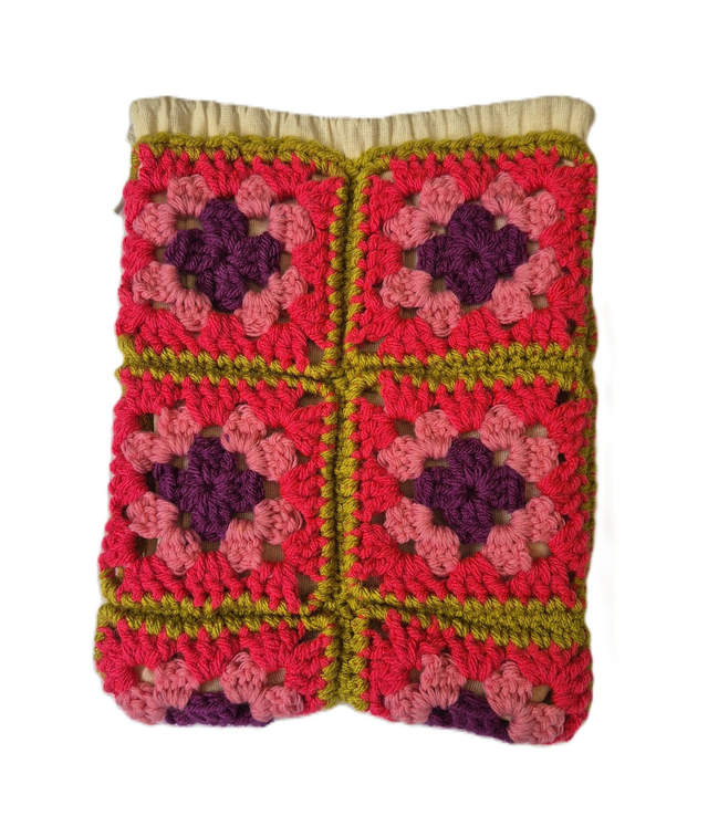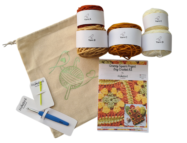 A beautiful crochet kit to make a project bag, using granny squares in four different colours of yarn. This kit is suitable for complete beginners to experienced crocheters, for those that don't know the basics please visit my website for PDF and video stitch guides.