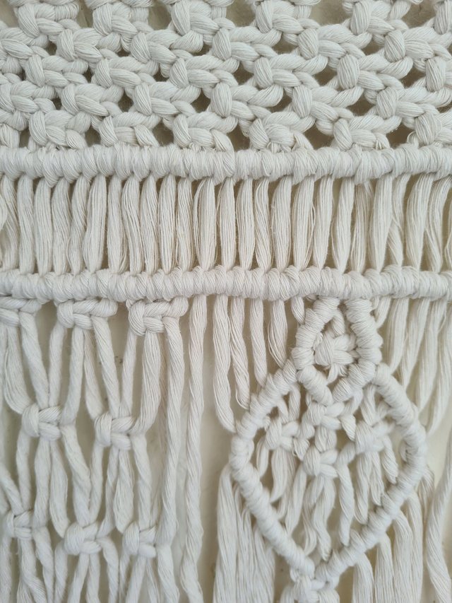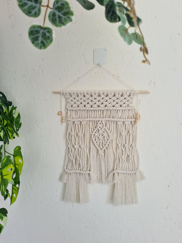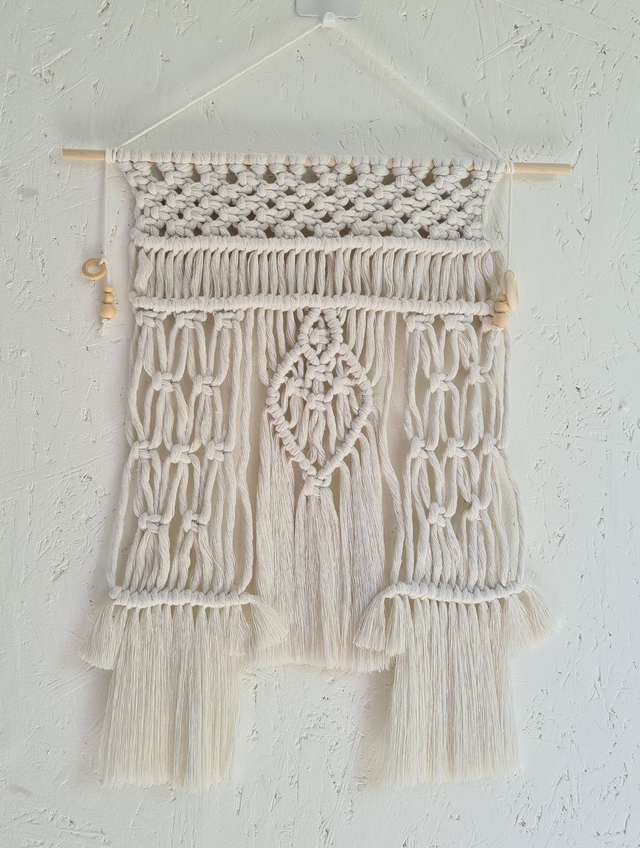 Made using 100% recycled 3mm cotton string in a natural colour with wooden dowel, beads, rings and five mini pegs.