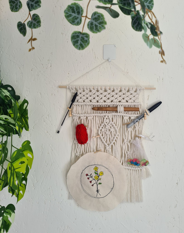 This wall hanging can either be hung to enjoy on it's own or used as a photo/notice board. There are two different sized wooden rings to hold pens.