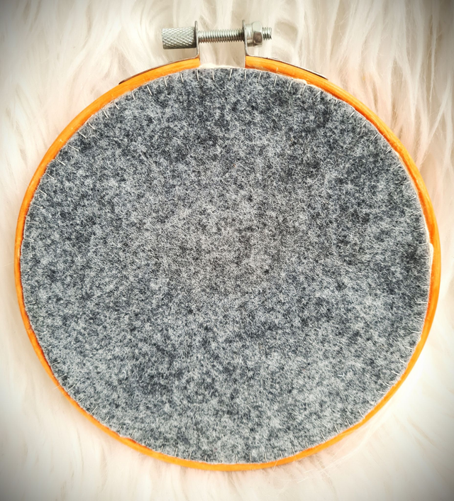 Calico fabric in a 5" wooden hoop, with a hand sewn backing of grey felt.